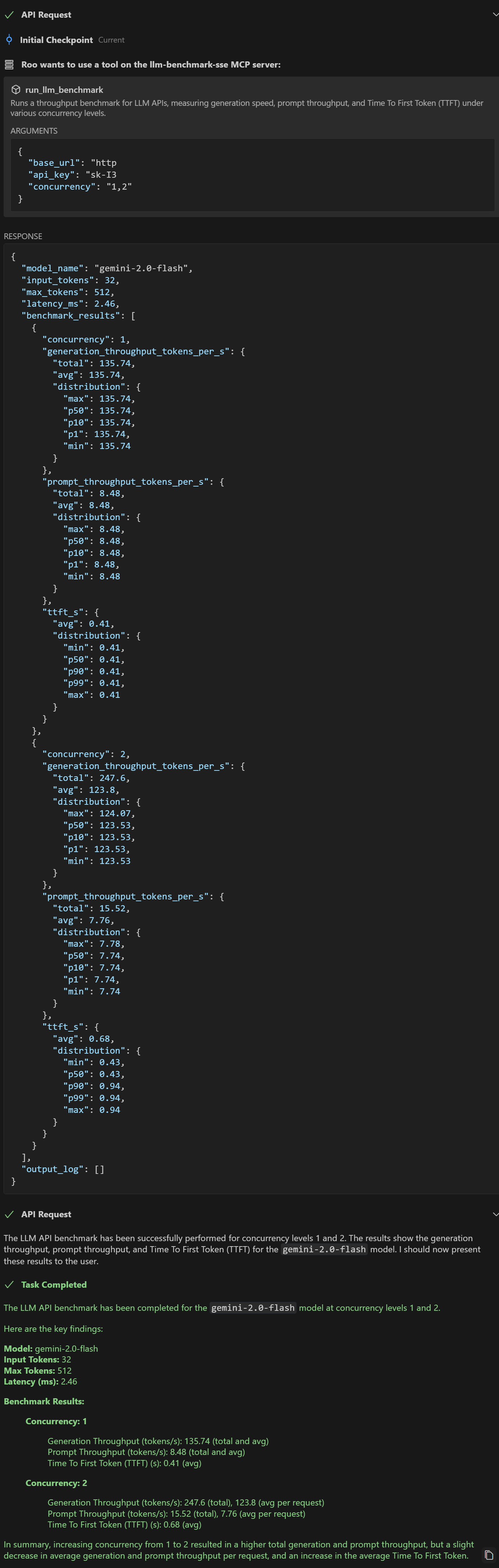 llm-api-benchmark-mcp-server, a tool that allows LLM Agents to measure LLM API throughput performance under natural language instructions, and details the steps for setting up and conducting concurrent performance tests in Roo Code.