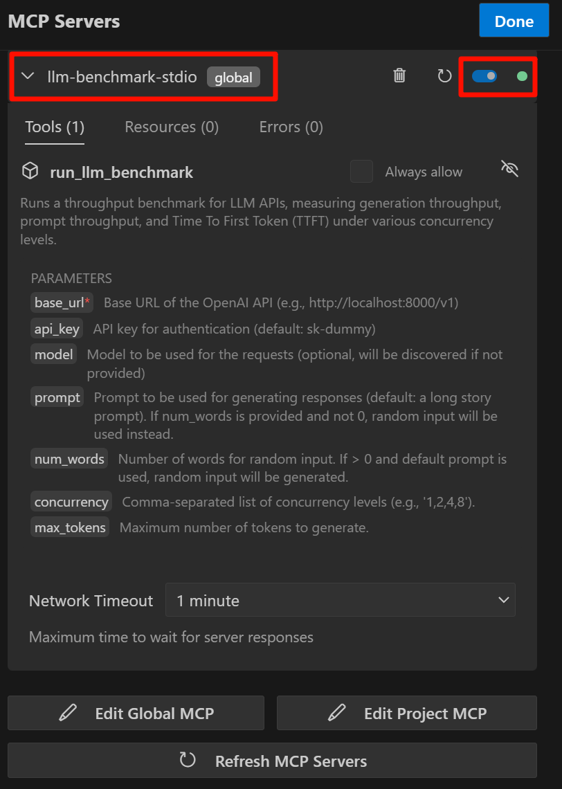 This article mainly introduces the MCP Server, implemented based on this project, which allows your LLM Agent to have a tool that can measure LLM API throughput performance, thereby helping you complete a series of concurrency tests under your natural language instructions.